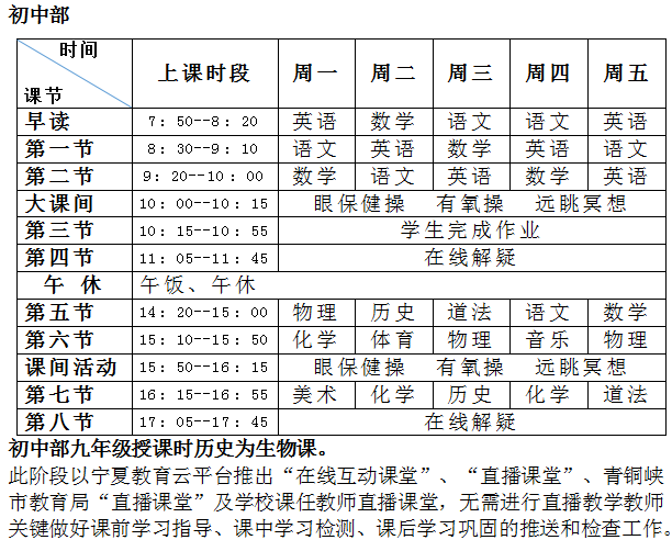 根据国家教育部、自治区、青铜峡市“在线课堂”教学精神,我校选择宁夏教育电视台、宁夏教育云平台、手机云校家app、出口成章app、班级微信群,结合区教育厅空中课堂课表及学校课表开展在线课堂教学。