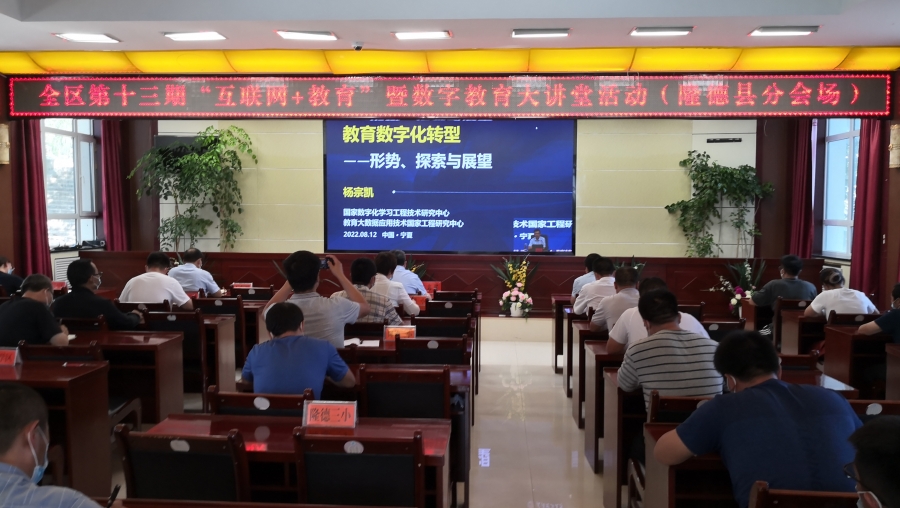 为深入贯彻落实国家教育数字化战略行动,营造全民参与数字素养与技能提升月活动的浓厚氛围,根据教育部办公厅《关于举办2022年“数字教育大讲堂”活动的通知》(教科信厅〔2022〕31号)。8月12日下午,区教育信息化管理中心举办了第十三期“互联网+教育”暨数字教育大讲堂,隆德县在教育体育局设分会场组织收看讲座。