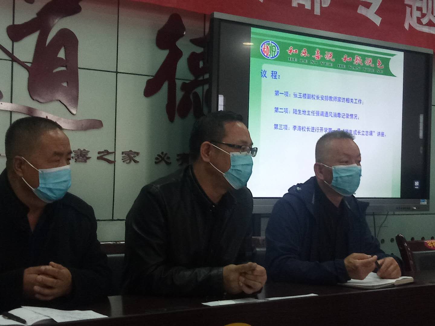 内容为:1. 张玉楼校长安排学生健康摸排工作:①1-8年级全体教师从3月30日开始按照安排,深入到每名学生家中,了解调查学生身体状况,认真填写《市三中新冠肺炎防控教师入户调查学生健康档案》,指导学生认真填写《学生体温记录单》,学生开学当天必须持《学生体温记录单》到校报到;②了解学生空中课堂学习情况及存在问题;③家访摸排所用数据要真实有效并签名留影;2. 陆生地主任强调通风消毒记录情况; 3. 李涛校长进行“开学第一课”立志成才课讲座,并提出了相关要求。