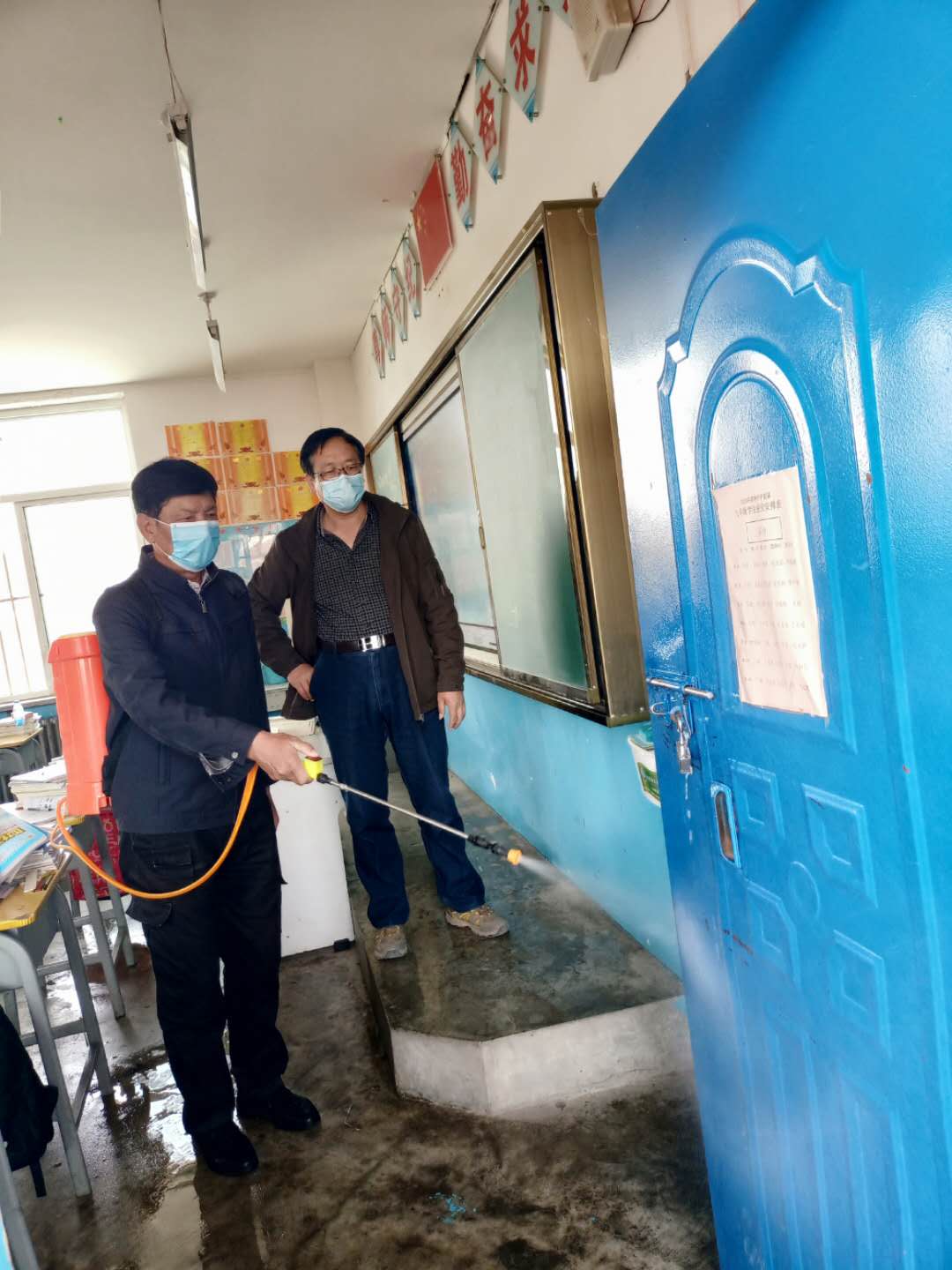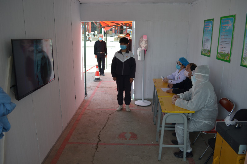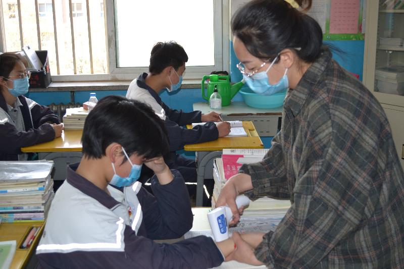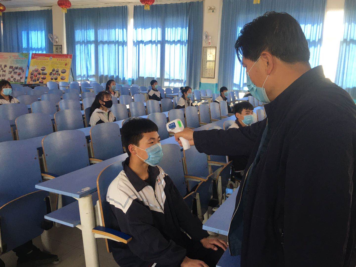 学校疫情防控工作人员提前到岗,严格执行入校测体温、消毒等准入制度,入校后更换工作服,在隔离通道等待学生进入校园。