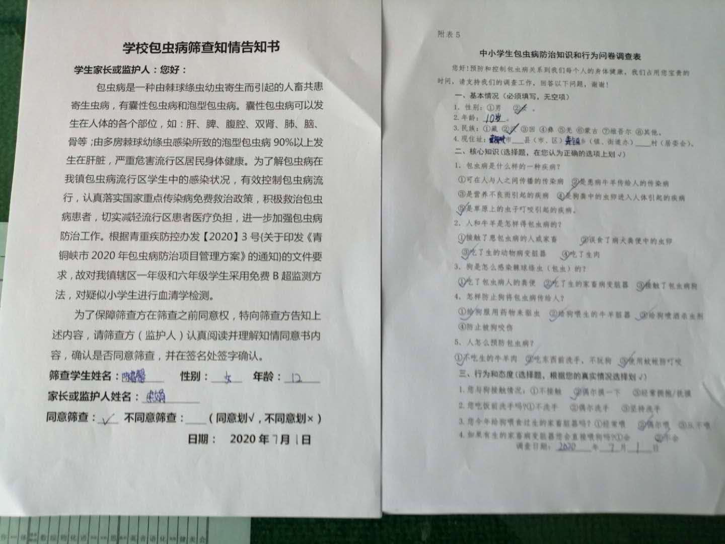为了解包虫病在青铜峡镇包虫病流行区学生中的感染状况,有效控制包虫病的流行,认真落实国家重点传染病免费救治政策,积极救治包虫病患者,切实减轻流行区患者医疗负担,进一步加强包虫病防治工作。根据青重疾防控办发【2020】3号文件要求,2020年7月1日—2日青铜峡市三中与青铜峡镇中心卫生院联合开展了2020年包虫病筛查活动。