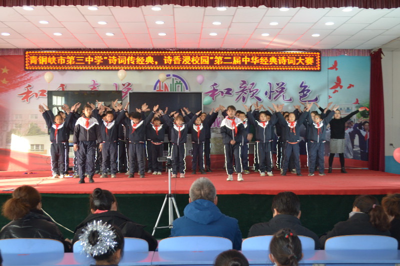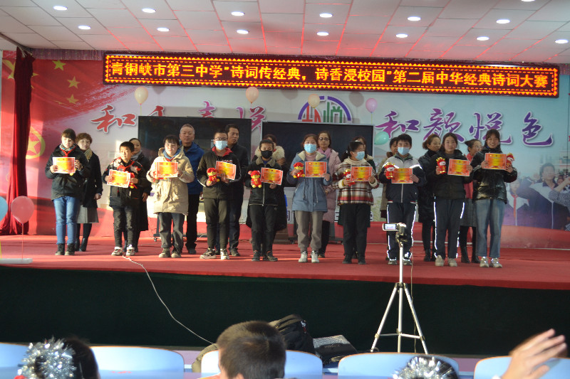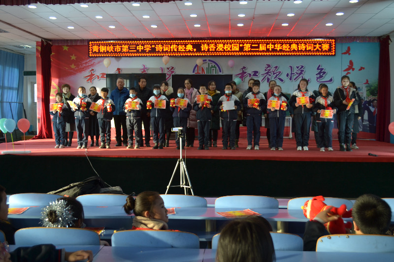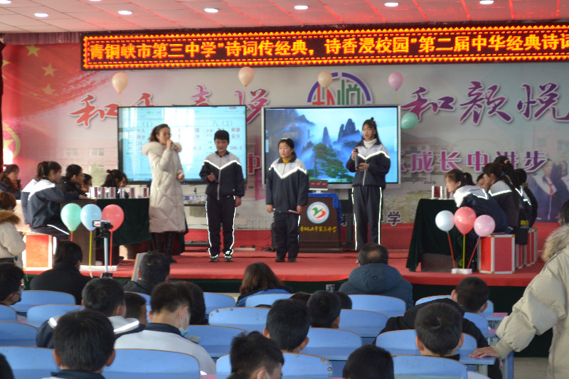 为了大力弘扬中华优秀传统文化,践行社会主义核心价值观,深入实施素质教育,创建良好的校园文化环境,营造浓郁的读书氛围。青铜峡市三中于2020年12月份认真组织开展了“诗词传经典,诗香浸校园”中华经典古诗词诵读活动。活动内容为:1. 编制诵读试题;2.诵读和默写督查;3. 诵读比赛【第一轮:精英赛(诗词接龙、千挑万选、雾里看花、飞花令);第二轮:班级自选诗文美诵;第三轮:班级现场抽取诗文美诵】4. 表彰奖励先进个人和集体。通过诵读活动,激发了学生诵读、记忆中华经典古诗词的兴趣,使学生在诵读活动中沐浴经典文化的恩泽,接受优秀传统文化的洗礼。