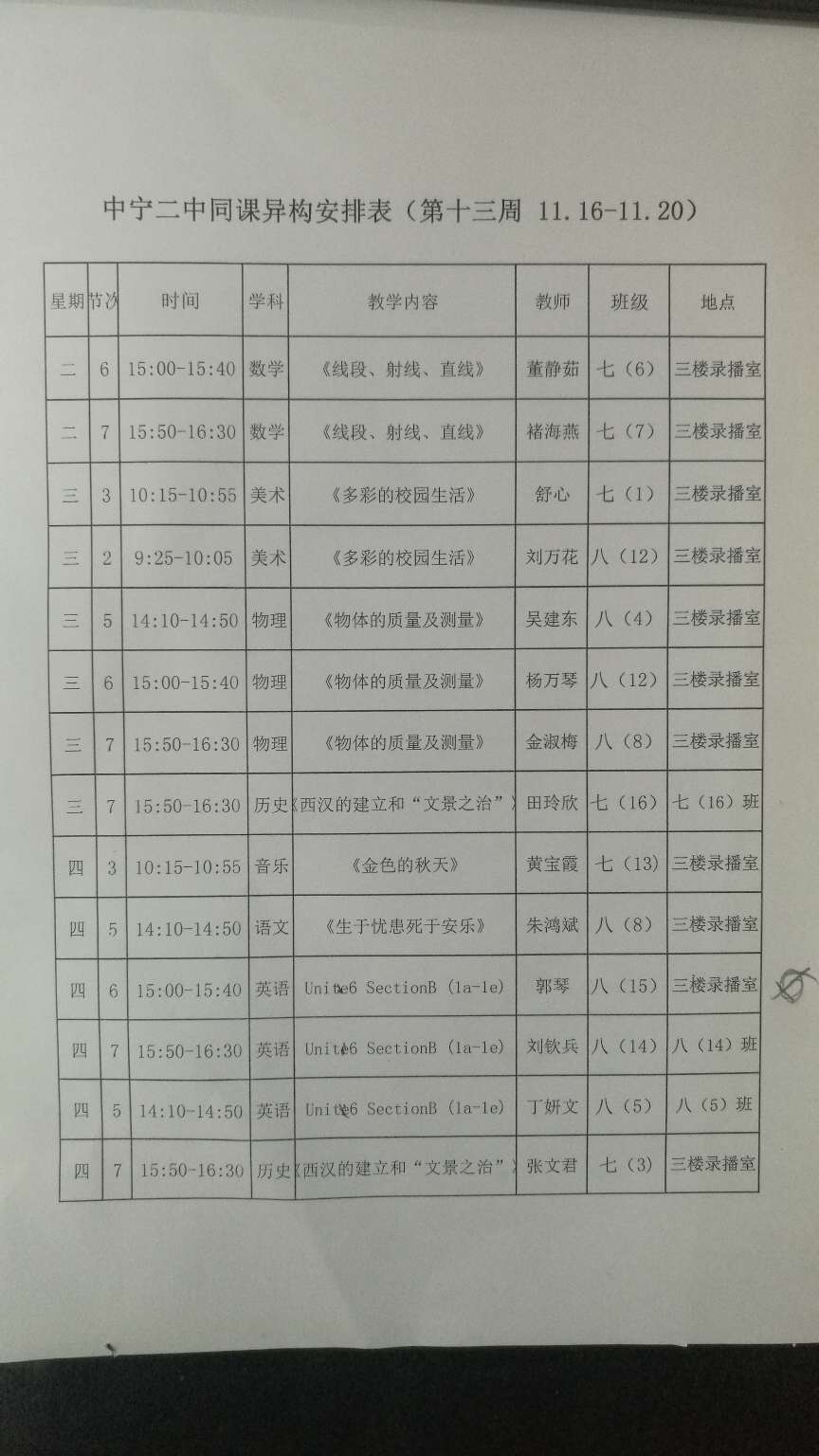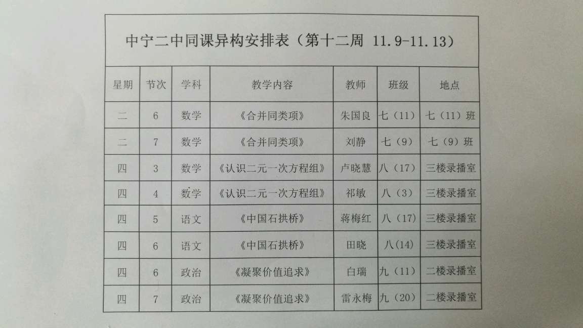 为了进一步落实教学常规,提高课堂教学效率,促进各组教师树立新的教学理念,鼓励广大教师深入开展课堂研究,改进课堂教学方式,提高课堂教学水平,促进教师专业化水平的提高,结合我校课堂教学实际情况和学生学情,切实把高效生态课堂落到实处,推进信息化教学,加强教育技术应用,提高课堂教学效率,加强各教研组、备课组教学研究,全面提升我校教育教学水平,中宁二中于11月9日--27日以教研组为单位开展了教师同课异构比赛活动。